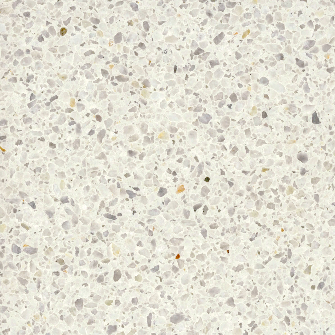 En lys og finkornet terrazzo med et let, elegant udtryk. Den varme, lyse base brydes af små stenstykker i grå, beige og gyldne nuancer, som tilfører et subtilt spil og en levende karakter. Det tætte mønster giver et ensartet helhedsindtryk, mens de små variationer skaber dybde og visuel interesse. Den slebne overflade fremhæver materialets naturlige detaljer og giver et blødt, raffineret finish.