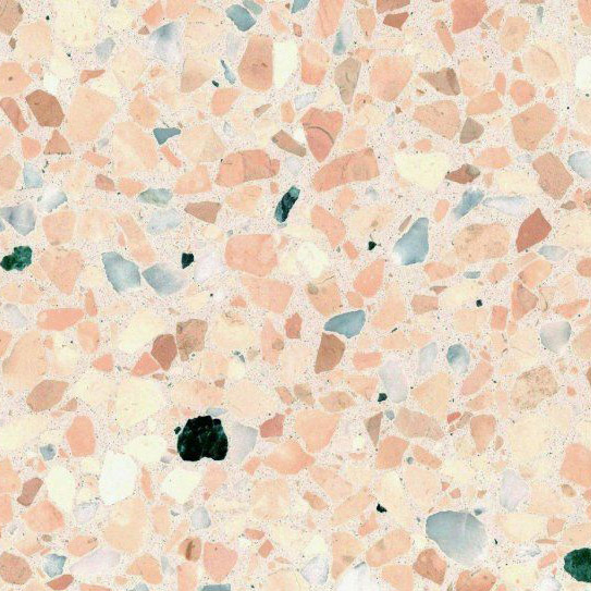 En livlig terrazzo med et varmt, dekorativt udtryk. Den lyse, bløde rosa base skaber baggrund for et varieret spil af stenfragmenter i koral, fersken og grågrønne nuancer, suppleret af enkelte mørkere indslag. Farvesammensætningen giver overfladen en let, næsten solvarm karakter med et elegant, afdæmpet spil. Den slebne finish fremhæver materialets naturlige struktur og giver et raffineret udtryk med en behagelig dybde.