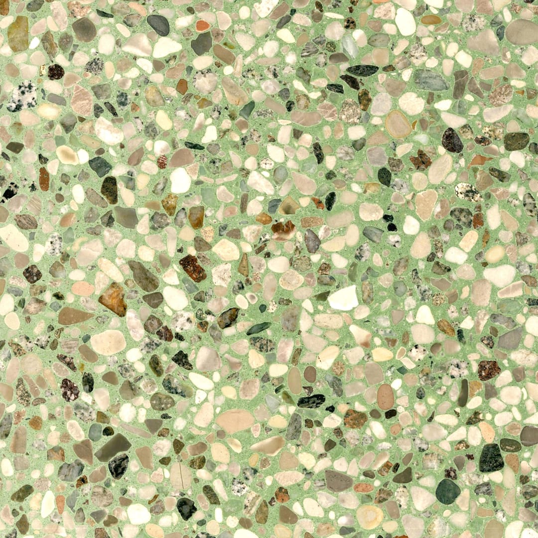En frisk og livlig terrazzo med et naturligt, let udtryk. Den bløde, grønne base tilfører overfladen en organisk tone, som danner baggrund for et varieret spil af stenfragmenter i beige, grå, hvide og varme jordfarver. De afrundede former skaber et harmonisk flow, mens farverne giver en balanceret variation. Den slebne finish fremhæver materialets struktur og giver et elegant udtryk med en behagelig, naturlig dybde.