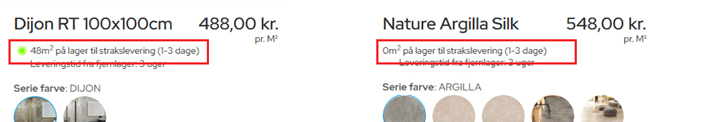 Øverst, under varenavnet, angiver en grøn prik at varen er på lager. Køber du fliser vil du også her kunne se, hvor mange m² vi har på lager.