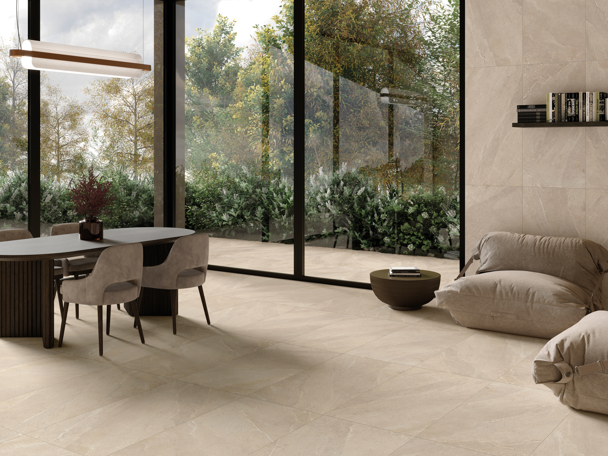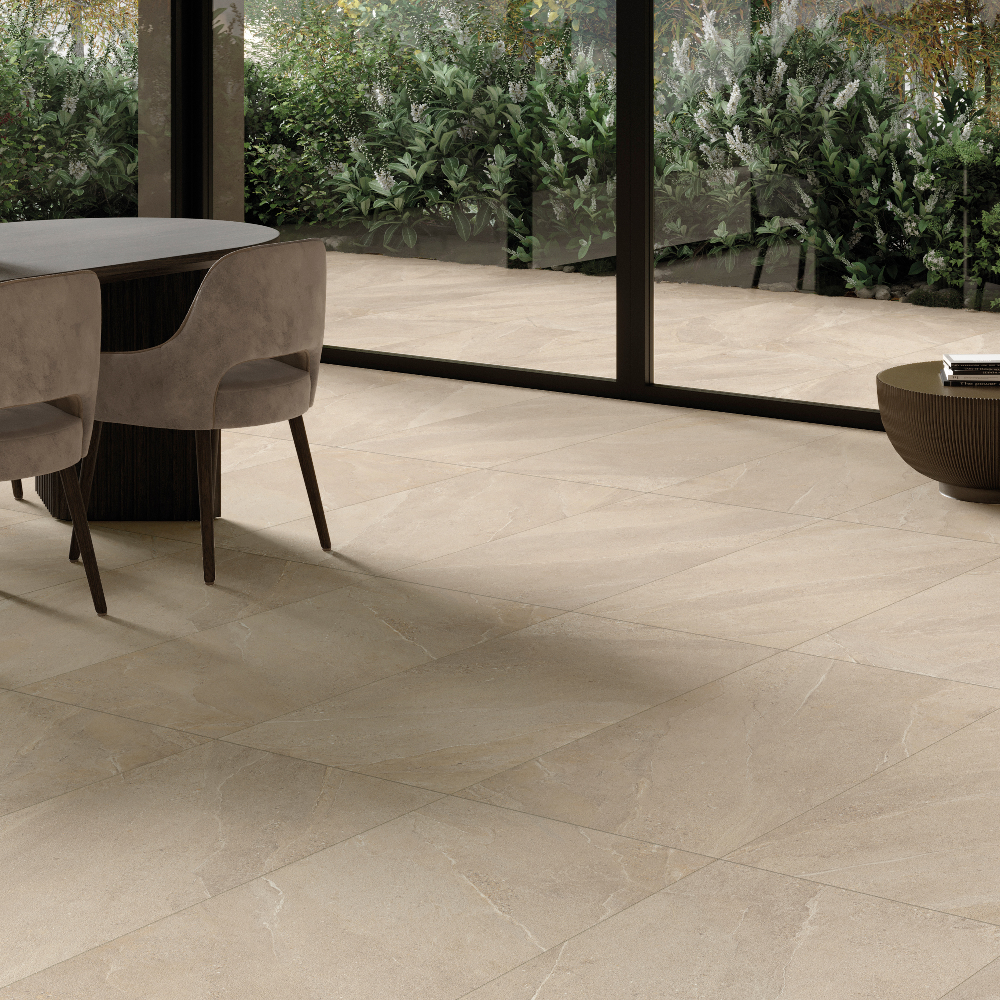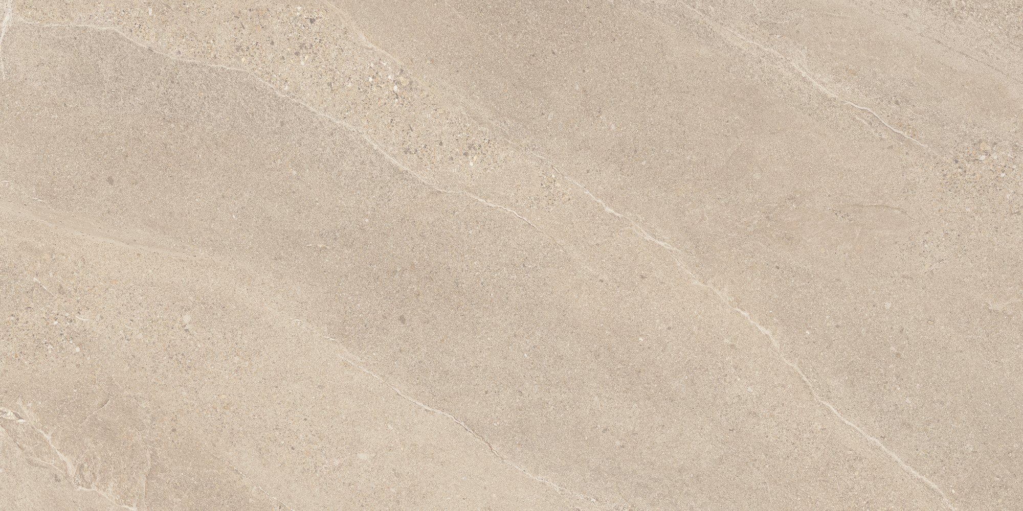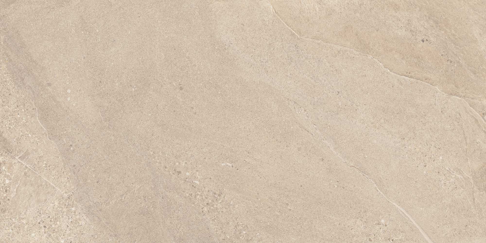 En varm, sandfarvet nuance med et blødt, naturligt udtryk. Overfladen har et fint, let kornet spil af små stenfragmenter, diskrete aftegninger og lyse årer, der bevæger sig roligt hen over flisen. Den beige nuances varme tone giver en behagelig dybde og imødekommende karakter. Helheden fremstår rolig og harmonisk, med tydelig inspiration fra sandede overflader.